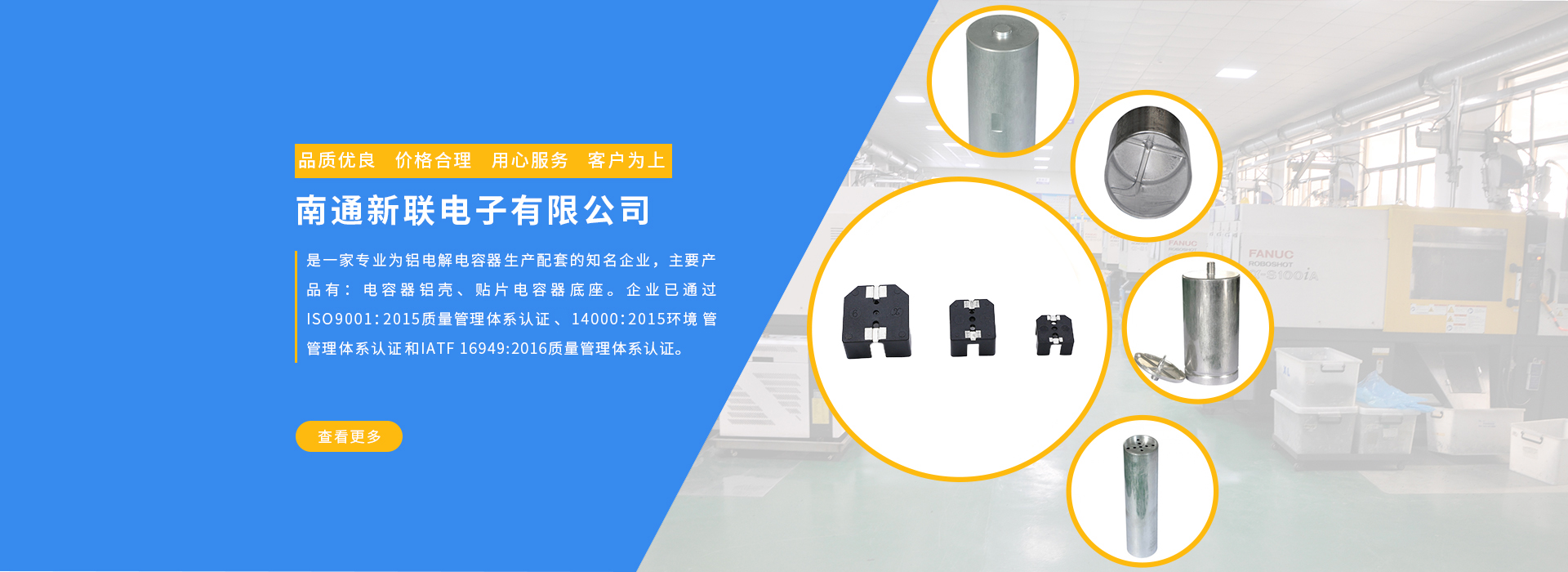 南通新聯(lián)電子有限公司是一家專業(yè)為鋁電解電容器生產配套的知名企業(yè),主要產品有:電容器鋁殼、貼片電容器底座。企業(yè)已通過ISO99001:2015質量管理體系認證和14000:2015環(huán)境管理體系認證。企業(yè)... MORE
